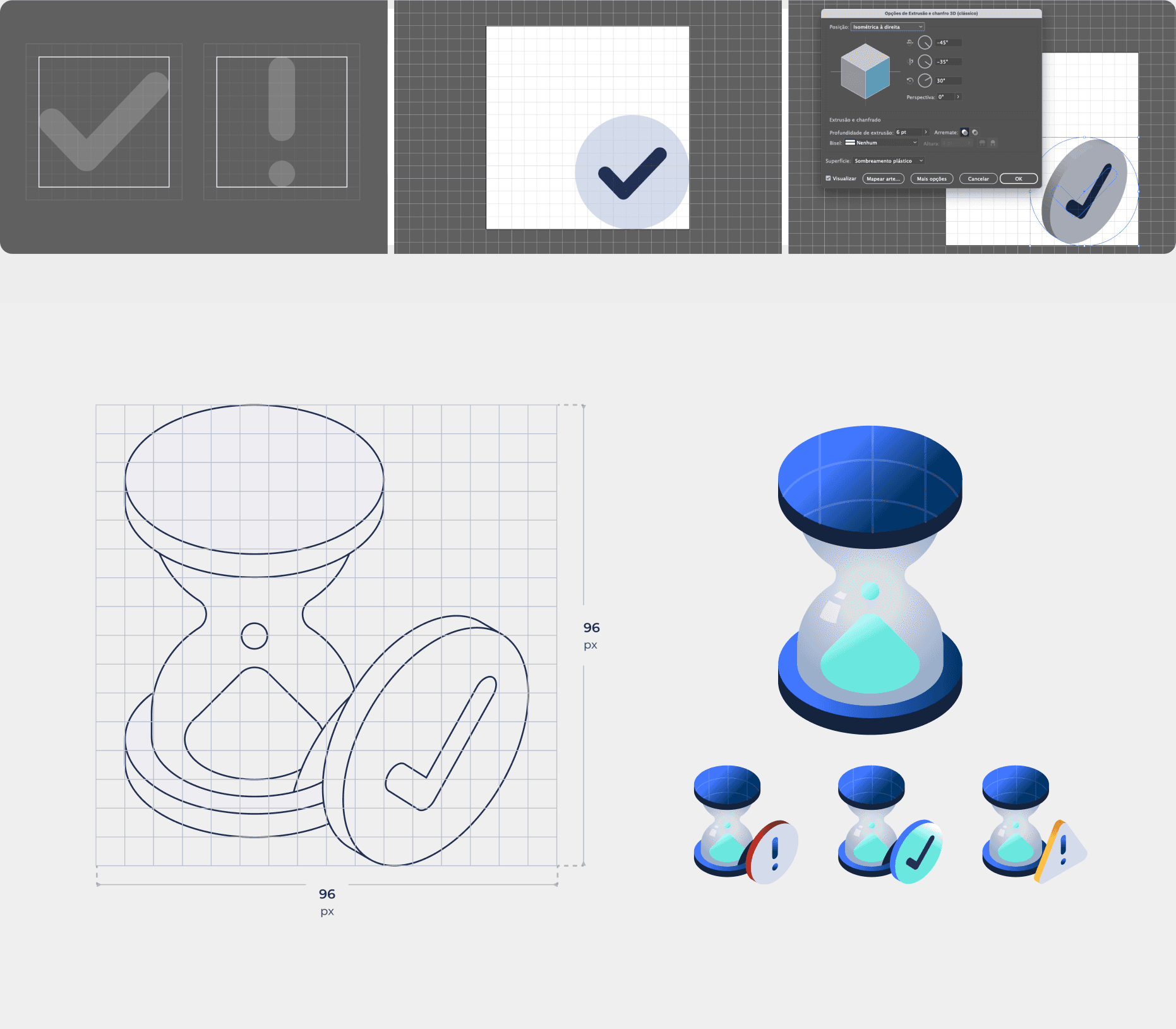 Para padronizar a construção dos elementos, a estrutura das ilustrações foi definida a partir de um grid quadriculado. Além disso, foram utilizadas formas simples, que garantem legibilidade e clareza visual em diferentes escalas.