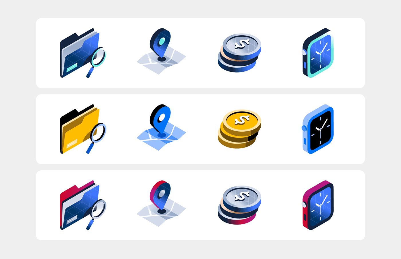 Necessitava-se que tudo fosse pensado de forma adaptável, considerando um sistema multi-brand. Ou seja, usando a mesma base das ilustrações, pensei em formas de adaptá-las conforme cada identidade visual, conversando com os estilos e cores das interfaces.