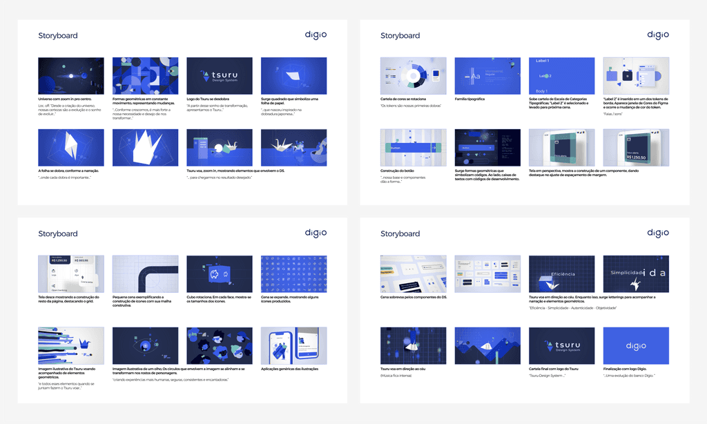Trocamos referências, alinhei expectativas e contei com a parceria da writing do time para transformar as ideias em roteiro. Com ele em mãos, desenvolvi o storyboard já pensando nas animações e validei com os envolvidos.